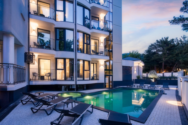 Мы всё ещё в Ялте, но теперь — в роскошных апартах с видом на море и центр города. Закрытая территория, панорамное остекление и балкон — всё это в 10 минутах от побережья и основных достопримечательностей курорта. Например, в шаговой доступности расположена одна из визитных карточек Ялты — легендарная канатка. Если не захочется нырять в море, присмотритесь к открытой террасе с бассейном.